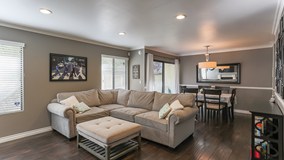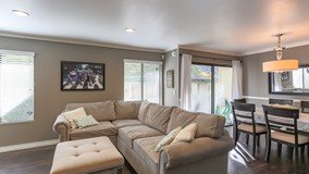 Located at the rear of the complex steps from the pool & spa, this tastefully remodeled townhome is a corner unit, boasts 3 bedrooms & 2.5 bathrooms, and is move-in ready. The main level features an open floorplan incl. living room w/ handsome fireplace, dining area opening to spacious patio, remodeled kitchen w/ quartz counters & stainless appliances, in addition to a convenient powder room & laundry closet. Upstairs, there are 3 bedrooms, incl. a master suite w/ vaulted ceiling, dual closets, and en-suite bath w/ marble tub surround, as well as a 2nd full bath w/ dual vanity & marble counters. In addition to the private 2 car garage, the complex features ample guest parking, 2 community pools, a spa, & tennis court, and the HOA provides quake insurance and hot & cold water. Welcome Home!