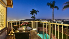 THIS SPECTACULAR HILLTOP HOME WITH PANORAMIC VIEWS IS LOCATED ON A SECLUDED CUL-DE-SAC IN THE EXCLUSIVE BELMONTE NEIGHBORHOOD OF VIA VERDE. This highly upgraded home features 4 bedrooms, 3 bathrooms, and a 3-car attached garage. This well-designed 2-story floor plan includes: a first floor formal living room with fireplace and formal dining room, both with vaulted ceilings; a window-lined granite kitchen with dark wood cabinets, all new stainless steel appliances, a center island and a spacious dining area; a step-down family room with fireplace and wet bar; guest bedroom; full bathroom; and a laundry room. The upstairs includes: a spacious master suite with a double-sided fireplace connecting to a cozy retreat; a master bathroom with over-sized tub and dual sink vanity; and walk-in closet. Connected to the master suite is a wrap-around walk-on deck with a 180-degree city light view. In addition, the upstairs includes two bedrooms with a connecting full bath and vanity, and an adjacent large bonus room with a balcony providing a view of the mountains. Other features: 3 solid-cedar rolling garage doors; built-in cabinets with work bench in garage; central vacuum system; monitored alarm; dual A/C units; mirrored wardrobes; plantation shutters; crown molding. The professionally designed backyard includes a secluded pool and spa, fire pit, and BBQ. Multiple lawn and patio areas highlight an incredible view, making entertaining a joy. Original owner; Smoke free. A MUST SEE HOME!