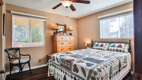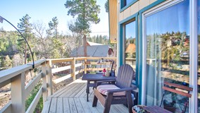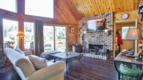Beautiful mountain home with wall of windows providing views of canyon, desert and seasonal creek. Open prow floor plan with soaring beamed ceilings, new wood laminate plank flooring, plus tongue and groove knotty pine paneling. Bedroom and bath on main floor with living room, dining room and kitchen. Level entry to main floor from driveway. Second master bedroom in loft overlooks living room with great view of canyon. Third bedroom is used as a game room with pool and game tables plus marble-topped bar. Furniture included. New concrete parking pad, driveway, and stairway. Small backyard with views. Rear deck off living room with more views. Laundry area in buildup behind bedroom includes connections for gas or electric dryer. Lowest buildup area would make a large workshop. Property includes Lake Arrowhead rights - boating & parks.