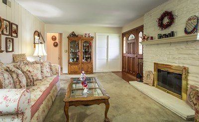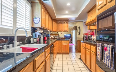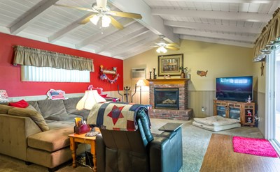Features a large family-room off the kitchen with cathedral ceilings, fireplace and double ceiling fans.
