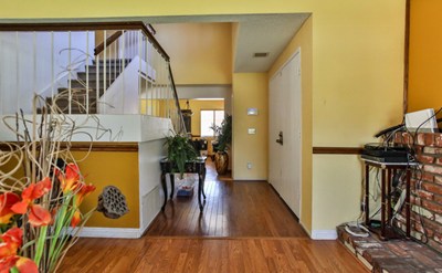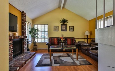 Charming two-story condo in the Creekside Community in Ontario, CA, with vaulted ceilings upon entry of the home. Features 3 BR, 2-1/2 BA, formal living room with fireplace, den/office, large kitchen with breakfast bar, granite countertops, tile flooring, sunny dining area with sliding doors leading to large covered patio, perfect for BBQ's and entertaining. Community amenities include swimming pool, tennis courts, grassy common areas, and plenty of guest parking. Low HOA's is a plus!