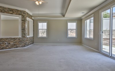 rock facade, and crown molding. Formal dining room to the left with living room straight ahead that features sliding door access to