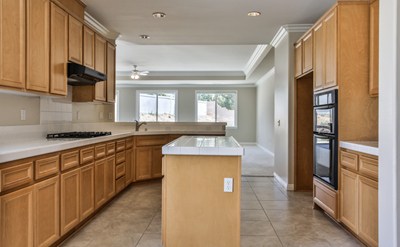 the backyard. Open gourmet kitchen with cooktop stove and a wall oven. There is also a kitchen island and separate prep area with