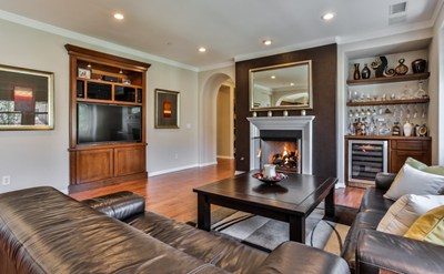 Highly desirable open floorplan situated on an elevated premium location. Seller paid a lot premium for this location as it faces the park & has an open view from the balcony, where others face a neighbor’s unit & garages. TREO’s Plan 1 features an expansive great room that boasts rich hardwood floors, romantic gas fireplace, custom media niche & bar area and surround sound pre-wire. Gourmet kitchen offers rich maple shaker cabinets w/ quartz countertops & designer tile backsplash, stainless steel appliances (range is electric, but gas valve is also present) & French doors open to the outdoor deck perfect for entertaining. Master suite w/ walk-in closet, Juliet’s balcony, separate vanities and dual entry shower. Second bedroom adjacent to full bath. 3rd bedroom downstairs is used as an office with no closet or door, this room can easily be converted to a bedroom. Laundry room located on main level. Meticulously upgraded throughout w/ designer paint, crown molding, window casing & some stone flooring. Garage has epoxy flooring & cabinetry. The inviting, yet private courtyard was professionally landscaped w/ beautiful flagstone flooring, water feature & mature landscaping. Enjoy resort style Woodbury living with 14 parks, 7 pools, recreation center & multi-purpose room, tennis courts, basketball courts, sand volleyball courts, tot lot, & picnic areas. Walking distance to Woodbury Elementary, Jeffrey Trail Middle School, Jeffrey Open Space Trails & Woodbury Town Center.