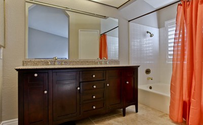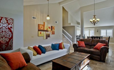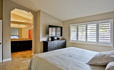 South Corona Complete Package! This house will be sure to impress you from the moment you step in. The soaring ceilings and the open/bright floor plan are PERFECT FOR ENTERTAINING. 4 bedrooms & 3 baths with one bedroom/bath downstairs, desirable cul-de-sac location with no Mello Roos or HOA dues, luxurious tumbled travertine tile on all floors, fresh designer paint on the inside, newer high-end plantation shutters with hidden tilt-bar feature, upgraded master vanity with dual sinks and an elegant chandelier in the dining area. The backyard is low maintenance with stamped concrete and a slope that can be used for fruit trees or an herb garden. The garage also has extensive cabinetry for storage. Homes like this go quickly, especially in this more affordable price range.