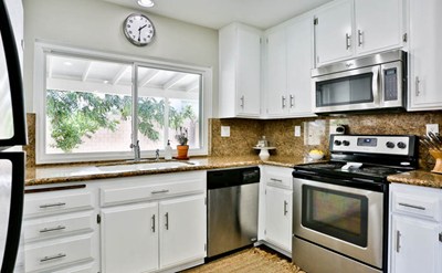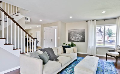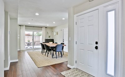 Great home filled with lots of upgrades! As you open the front door it welcomes you with the living area to the left and dining area to the right, then it leads into the remodeled stairs to the second floor. The entire home is freshly painted inside and outside, with Energy Efficient upgraded windows, and beautiful new bamboo wooden floors. The kitchen cabinets have been refinished with granite counter tops and new sink. Cozy fireplace located in living area. All bedrooms are upstairs, and they have newly installed closet doors. Also the two bathrooms upstairs have upgraded vanities, with tile flooring. Downstairs has a half bathroom next to a walking closet. Large 3 car garage, with one of the garages having a drive-through entrance availability to the backyard. It also has a large wrap around covered patio that adds lots of shade and privacy to the home for great entertainment, includes a grassy area for the kids and mature trees for more shade. This home is ready to move in! Come see it now and make it your own!