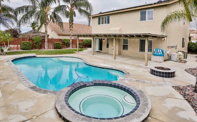 Turnkey pool home! This home sets the bar in the neighborhood. 4 bedroom, 2.5 bathroom, 2,555 square foot two story pool/spa home in the area of East Hemet. Home offers a bedroom & half bathroom on the lower level. It also offers a living room, family room & spacious kitchen. The Kitchen offers granite counters, center island, tile flooring w/granite inlay, & black appliances. There is brand new carpet and/or tile flooring throughout. The family room offers an upgraded mantel above the vented fireplace. There are white shutters, with a majority of them wood, throughout. There is a loft at the upper level landing. The upper level also offers 3 additional bedrooms, including the master, & the laundry room. The master bathroom offers two walk-in closets, upgraded tinted shower door, granite counters, dual sinks, & updated hardware. The interior is surrounded by beautiful custom paint colors, upgraded light fixtures, and updated hardware. The backyard has an approx 22,000 gallon free flow salt system pool and raised spa, adjacent to a long wood patio cover. The pool has a reef step, concrete coping, & blue tiles. There is a gas fire pit adjacent to the spa for those cool nights. The pool has solar heating & a new variable speed pump for efficiency. The home also has a 6+ KW solar system w/ a brand new solar inverter (2K). Additional features: 3 car garage, new window screens, ceiling fans, new AC condenser, custom front door w/window & security screen, & pool fence.