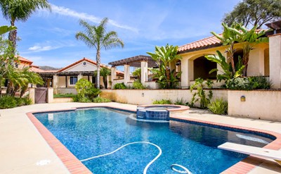 This 4 bedroom, 4 bath home sits on 8.5 acres and has space for everything you could ever imagine for your ultimate dream home. Enjoy beautiful sunsets in the Large Cabana with wet bar, custom BBq area, fire pit and beautiful fenced-in pool. Inside, you'll find an open kitchen, large family room, formal living room, and a master bedroom with sitting area and en suite bath. 3 bedrooms and an office downstairs, and a separate bedroom upstairs with it's own bathroom, bonus room and balcony. Besides a 2-car garage, the property features a 1200 sqft. workshop/garage/future guesthouse which is wired for 220 and includes an office and upstairs bathroom. There is plenty of parking for your guests, RV or boat. Back yard has large grass area with an offset garden and amazing views of surrounding hills and valleys. There is a graded area behind the home which is ready for your basketball court, tennis court or new guest house. The large acreage in the front of the home, which was once home to an avocado and grapefruit grove, could easy accommodate a vineyard, barn or even a baseball field. The long driveway has been prepared with electrical conduits for lighting and electrical to the base of the property.