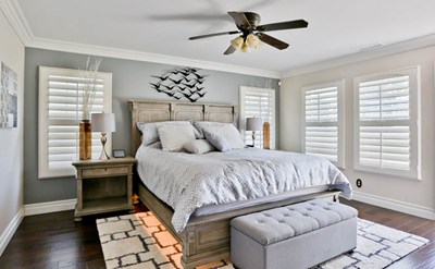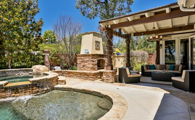 Transitional Cottage Style home on large corner lot encompasses all features of indoor-outdoor family living. On the main level, entertain family and guests with large open informal family room with surround sound speakers, custom fireplace, and accordion doors opening out to resort style backyard. Previous model home, extended living room upon entry with temperature controlled wine closet and French Doors to covered patio and outdoor fireplace. Main floor den/guest room includes frosted glass and wood barn doors for added privacy. Open kitchen with granite counter tops featuring seating at the bar, walk-in pantry, built-in wine refrigerator, breakfast nook and disappearing kitchen window for easy pass-thru to outdoor kitchen. Home automation system controls closed circuit television with 4 cameras for TV viewing, touch screen automated alarm, recessed speakers, external lighting, and dual-level air conditioning. Four bedrooms upstairs with open seating area. Master Suite features sweeping city and mountain views out balcony while bright master bathroom includes stone flooring, dual granite vanities, free standing soaking tub, dual shower head walk-in shower, his & hers walk-in closets, and balcony. Three large secondary bedrooms with beautifully remodeled hall bathroom. Resort style backyard encompasses custom salt-water pool and oversized Jacuzzi, overhead gas heaters, fireplace, rock speakers, Lynx barbecue, outdoor refrigerator, citrus trees and dog run.