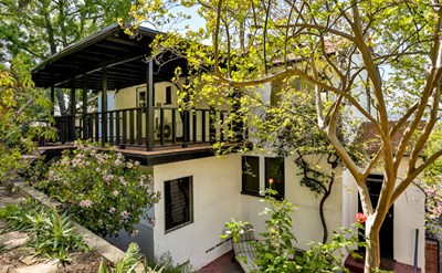 Perched above the street on an incredibly peaceful & private lot with city & mountain views, this light-filled 1930s Monterey Colonial Revival-style 3 bedroom home in the coveted San Rafael Hills is on the market for the first time in 50+ years. Architectural details such as the original hardwood floors & door hardware throughout, and the living room's beamed ceiling & fireplace with hand-painted tiles exude period charm, while the dining room & adjacent family room's open floorplan provide ample space to meet modern day needs. All 3 bedrooms upstairs open to covered exterior porches, and a room off the formal entry could make a great 4th bedroom or home office. The front yard & backyard have multiple patios shaded by mature shrubs & trees, and there's also a detached garage with storage loft. Available for only the 2nd time since it was built, this home shows pride of ownership, and presents a great opportunity to move in and, over time, update & thereby further enhance this beautiful home.