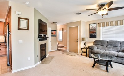 This Dual Master condo has an open-concept layout with natural lighting plus a cozy fireplace and custom compartment built-ins in the living room. Intimate dining or group gatherings can take place in the spacious dining room. The kitchen has received a make-over featuring Maple Spice colored cabinets, custom back splash, granite counter tops, decorator shelving, under counter lighting, and a large double-basin stainless steel sink with upgraded water feature. BBQ all year round on the nice size stamped decorator concrete patio with wrap-around planters and a private pedestrian gate that opens to the community green belt. Downstairs is a large, fully updated 1/2 bath featuring upgraded cabinetry, designer paint, and granite counter tops. Upstairs are two oversize Master Suites each with their own private, newly renovated bathrooms. Additional features in this home include designer paint throughout, large walk-in closets, step-in shower and shower/tub combo, window treatments, freshly painted patio fencing, upgraded stair handrail, indoor laundry area, and a 2 car detached garage. Community amenities boast tennis courts, a playground, pool & spas! Located within the award-winning Central School District near Victoria Gardens.
